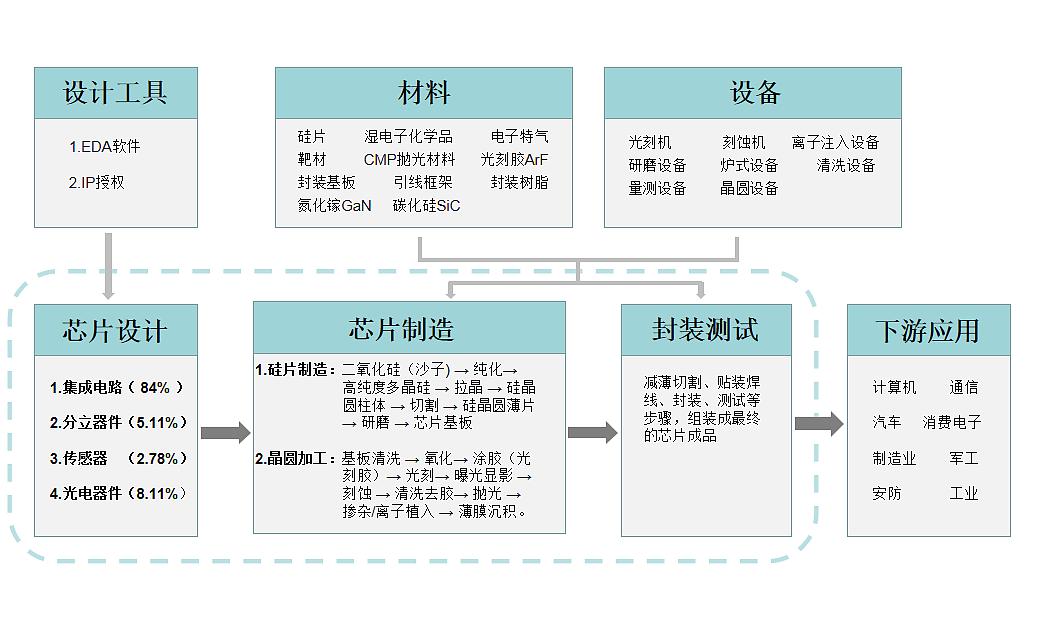 半导体行业的产业链主要是由芯片设计、代工制造、封装测试三部分,以及产业链外部的材料,设备供应商组成。