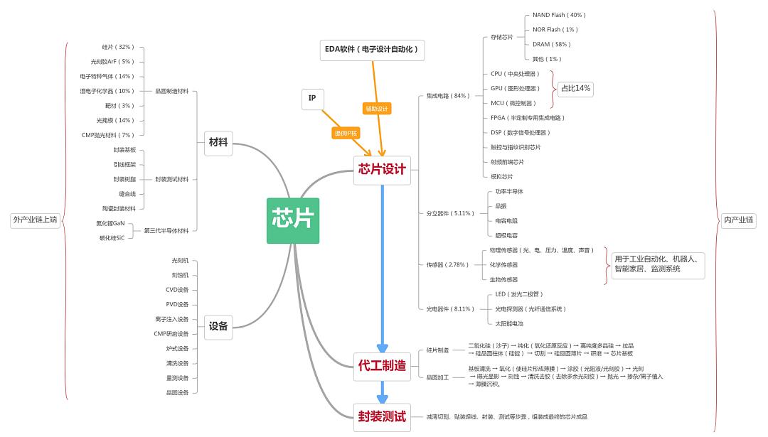 首先看一下半导体产业链全景图,主要分为三大板块和两小板块。
